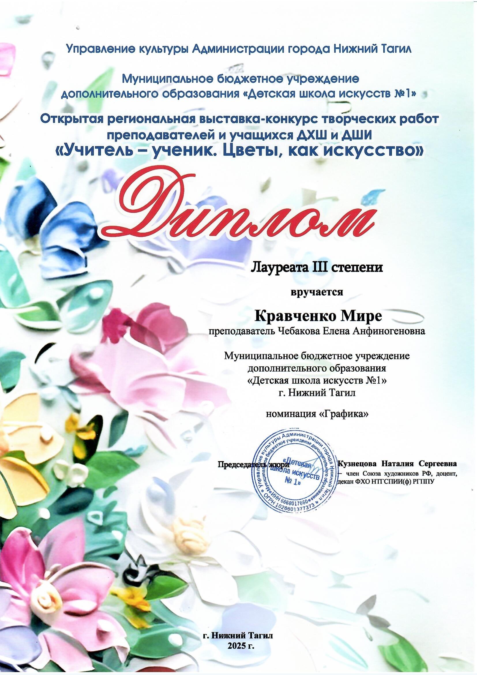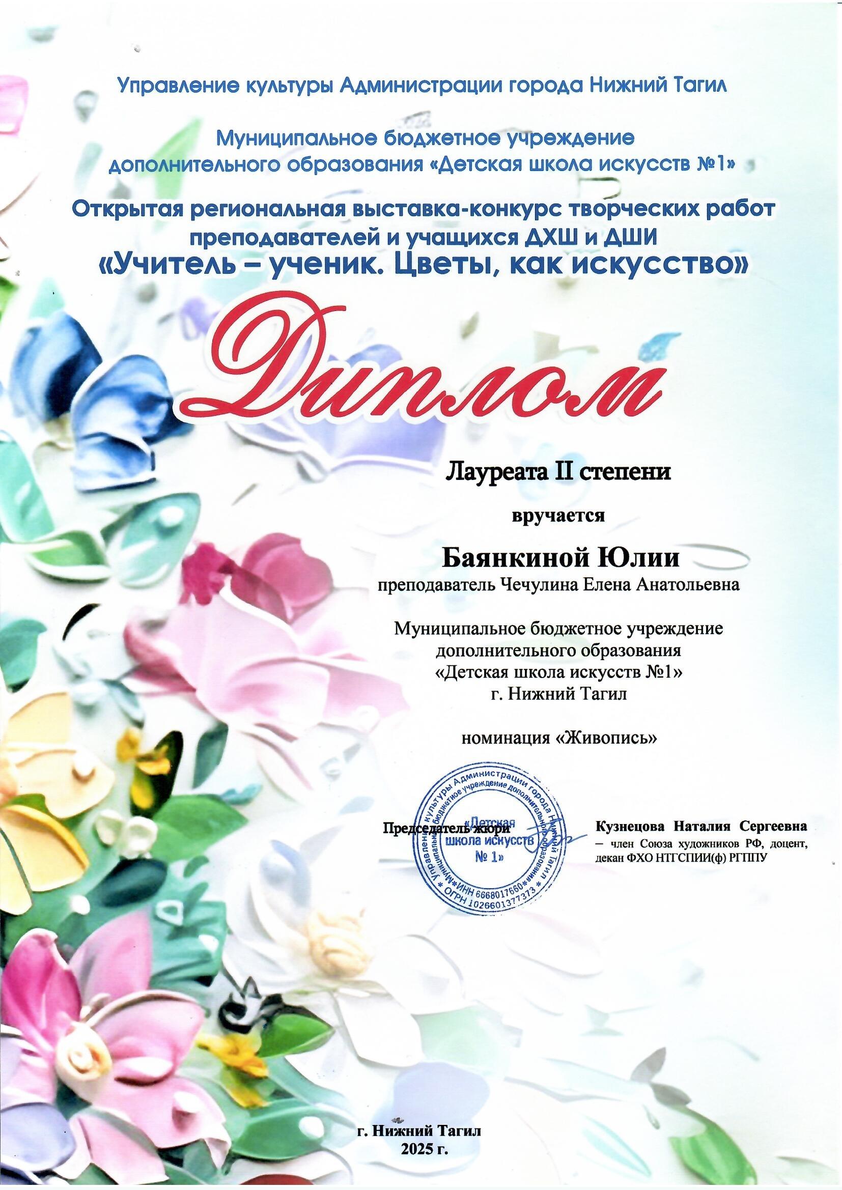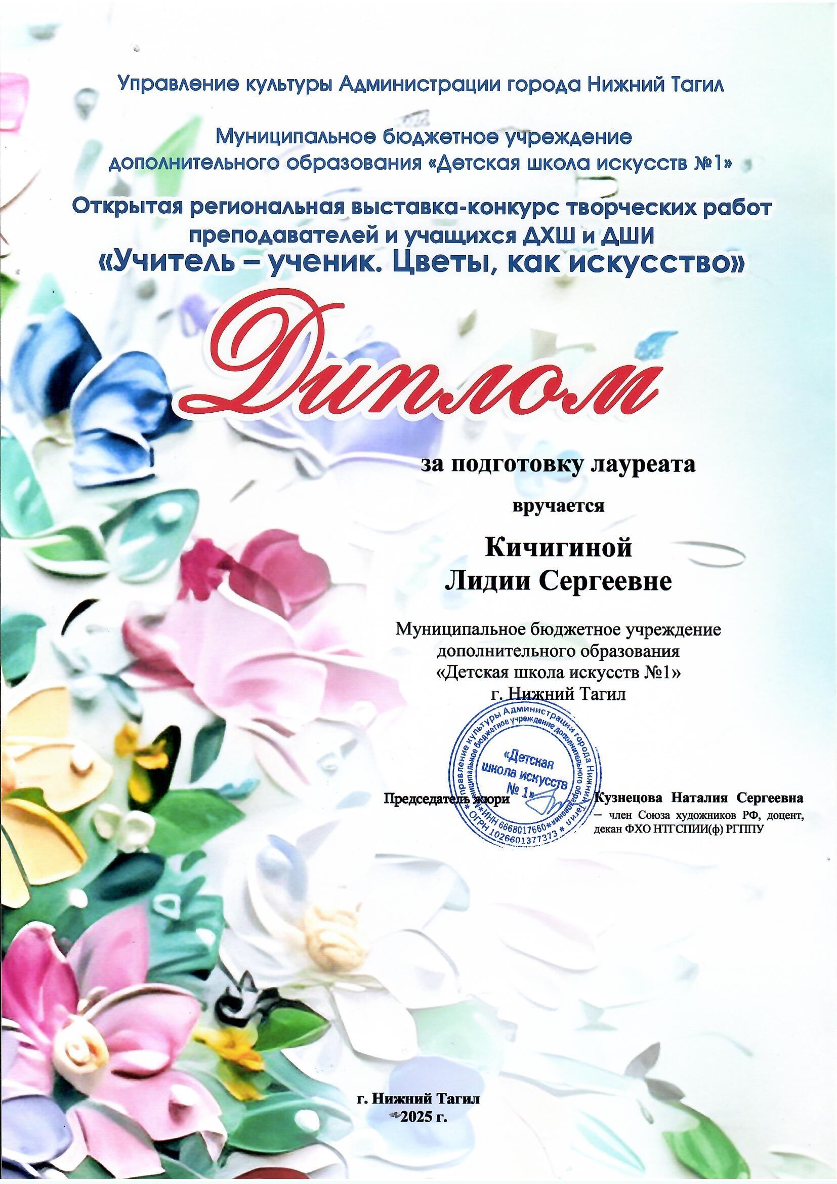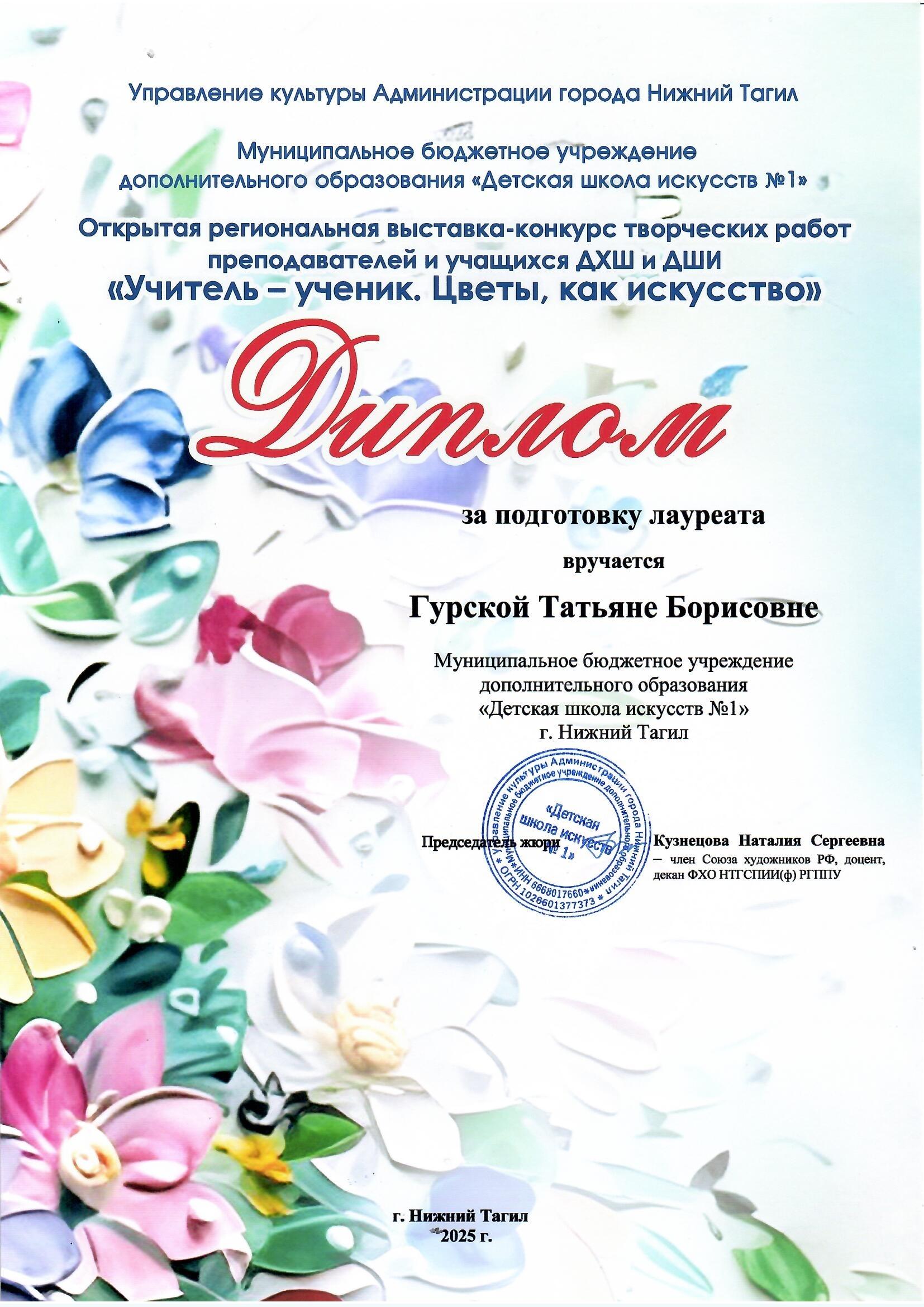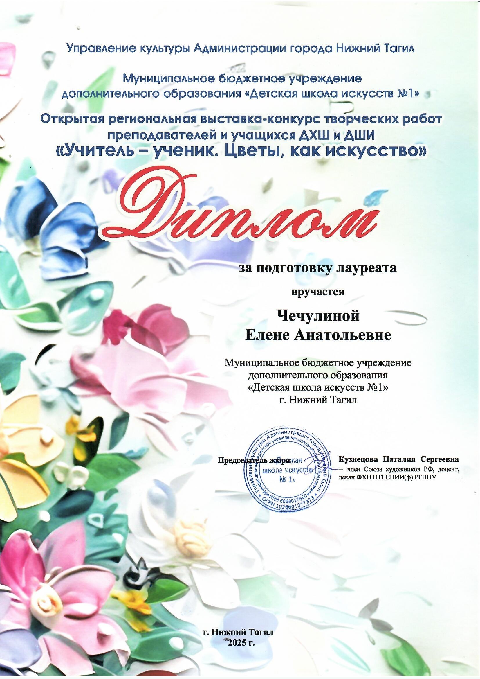 По результатам участия в региональной выставке-конкурсе творческих работ преподавателей и учащихся ДХШ и ДШИ "Учитель-ученик. Цветы как искусство", проходившей в МБУ ДО "ДШИ №1" были достигнуты следующие результаты :