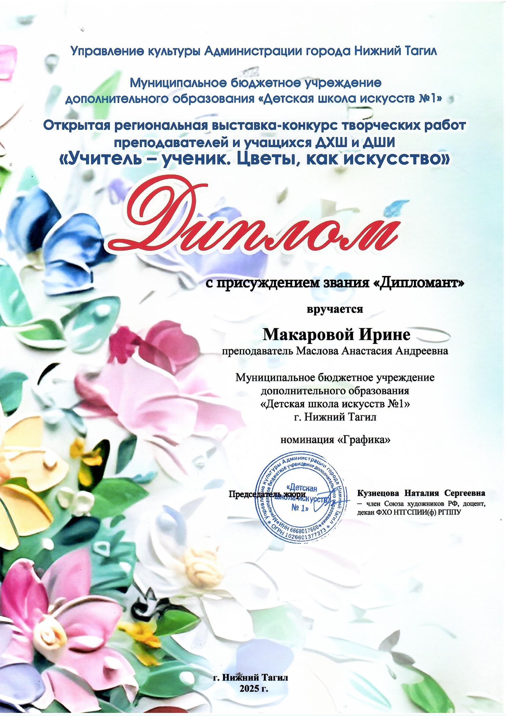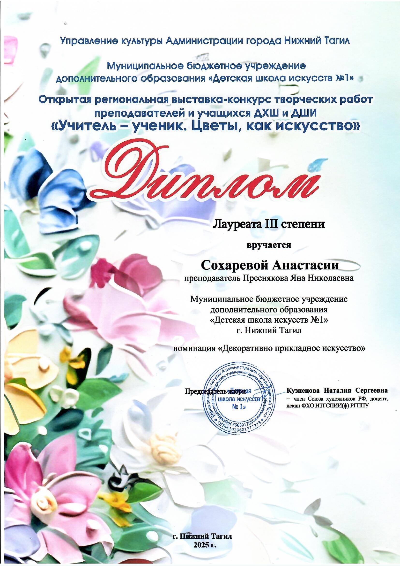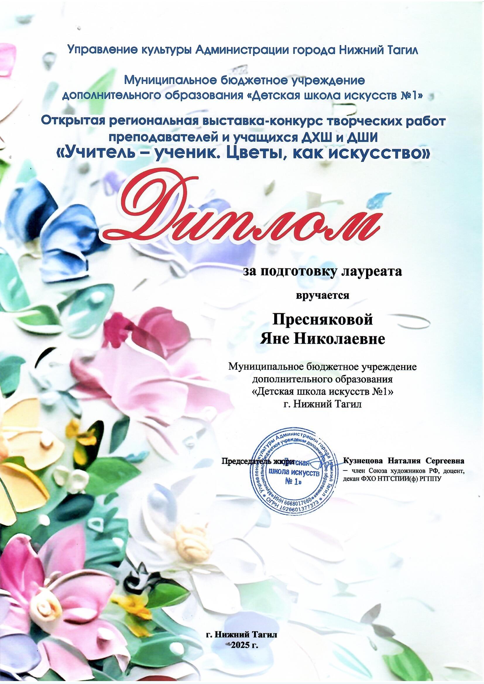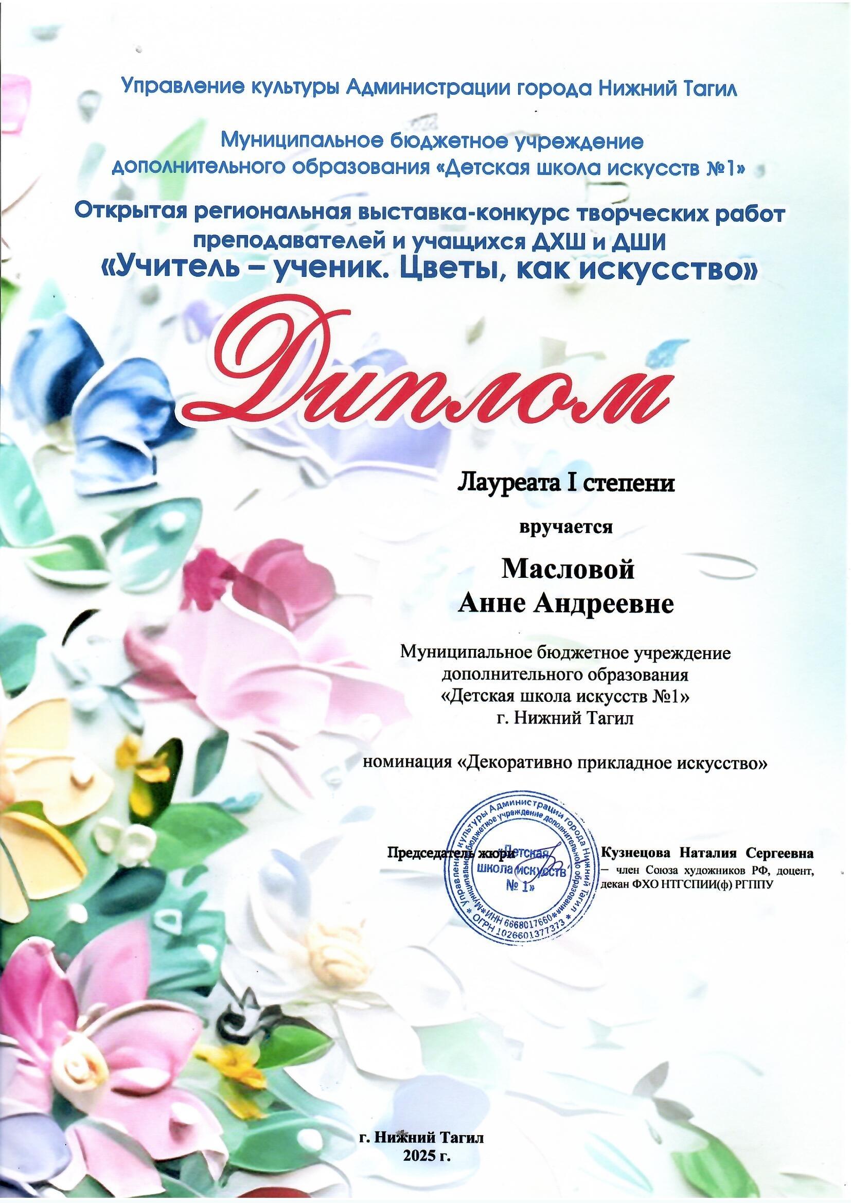 По результатам участия в региональной выставке-конкурсе творческих работ преподавателей и учащихся ДХШ и ДШИ "Учитель-ученик. Цветы как искусство", проходившей в МБУ ДО "ДШИ №1" были достигнуты следующие результаты :