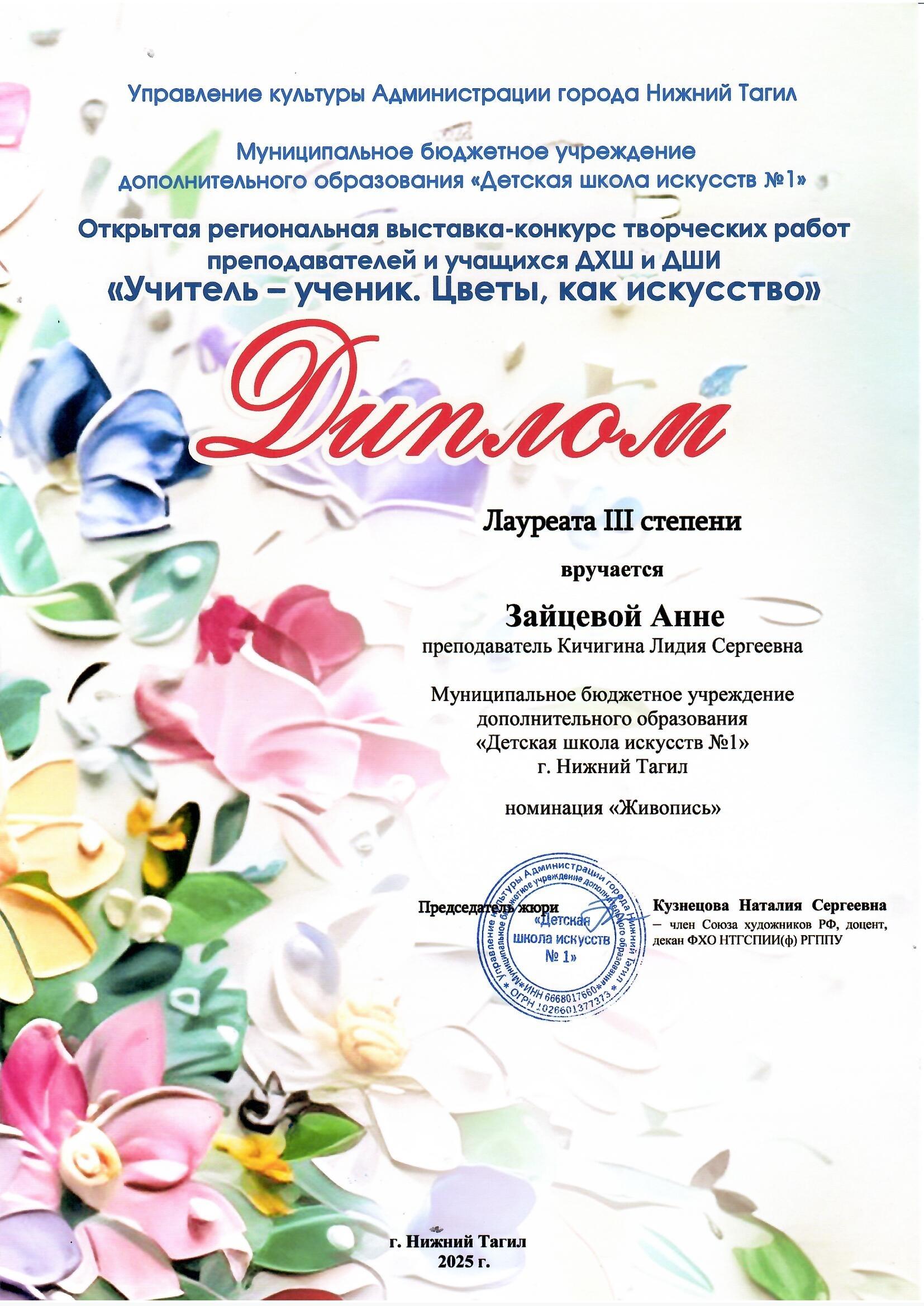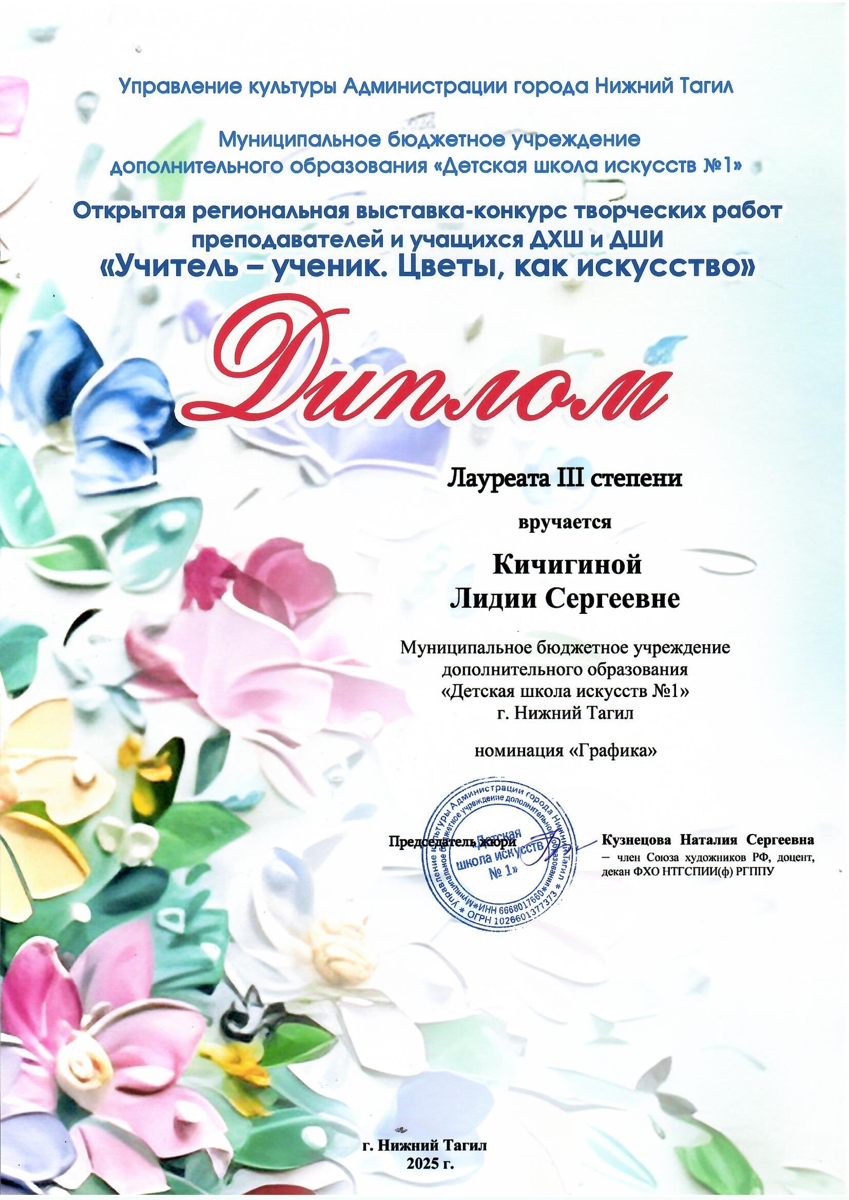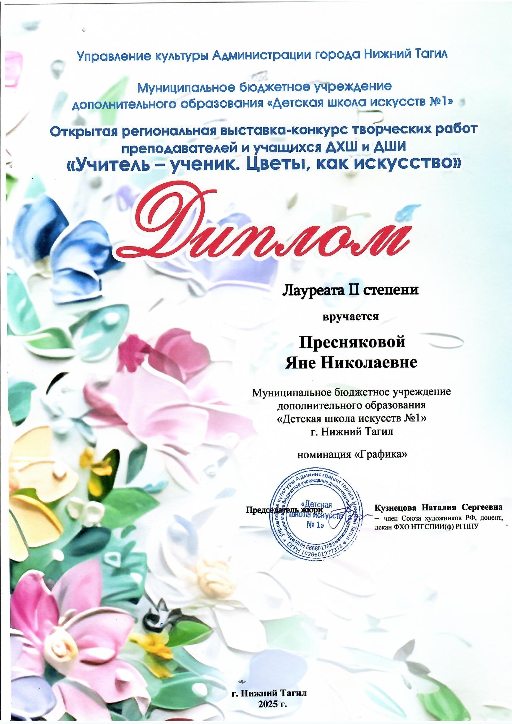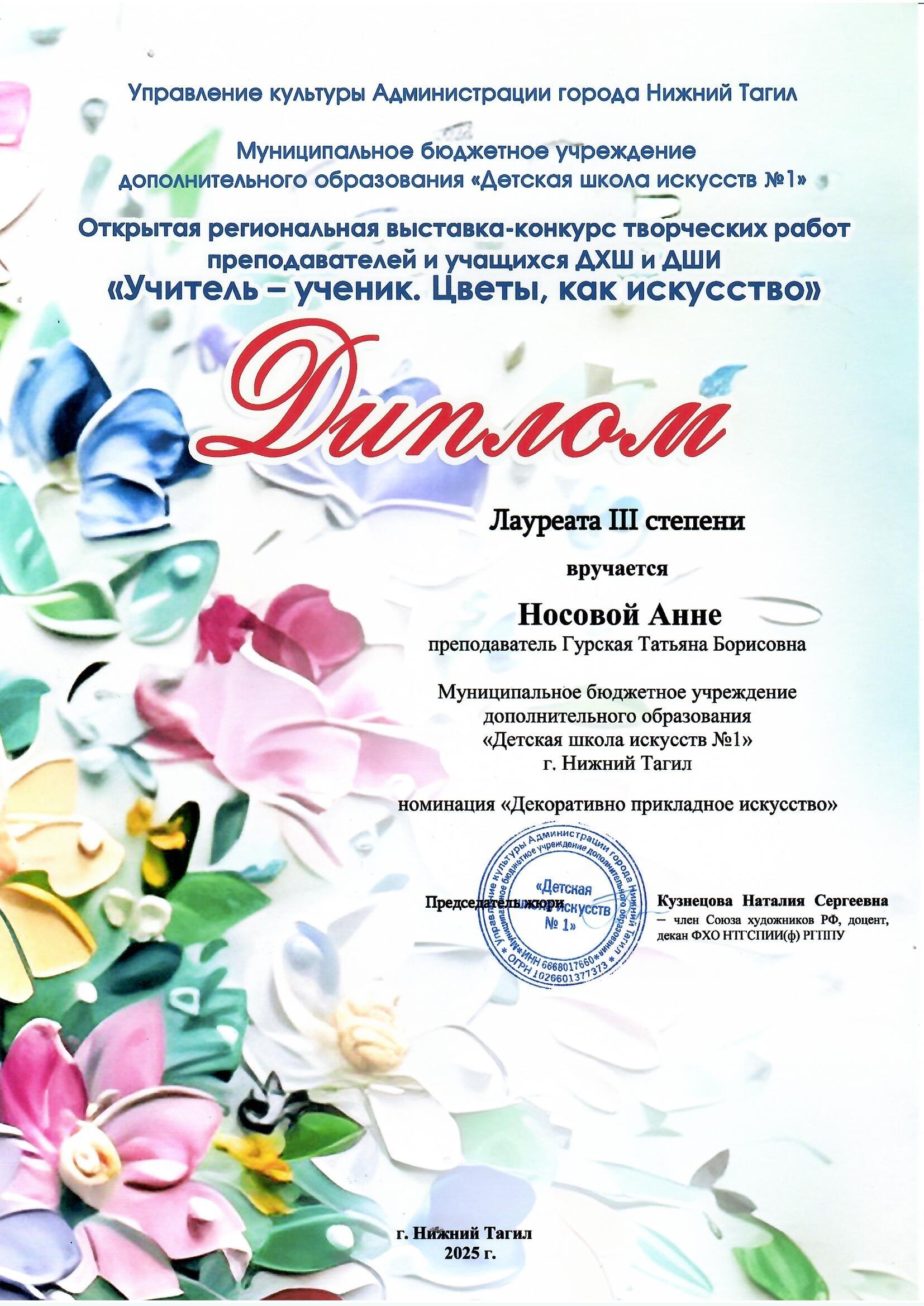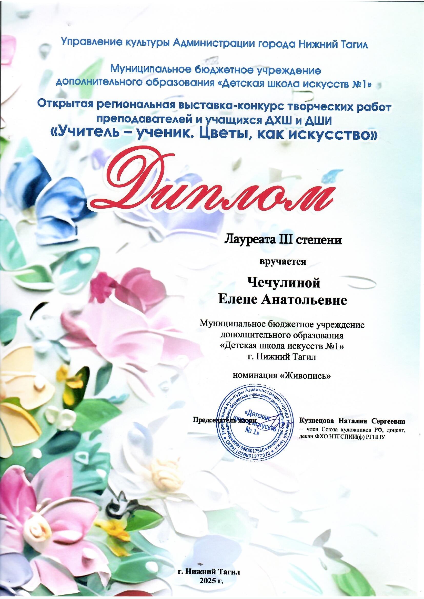 По результатам участия в региональной выставке-конкурсе творческих работ преподавателей и учащихся ДХШ и ДШИ "Учитель-ученик. Цветы как искусство", проходившей в МБУ ДО "ДШИ №1" были достигнуты следующие результаты :
