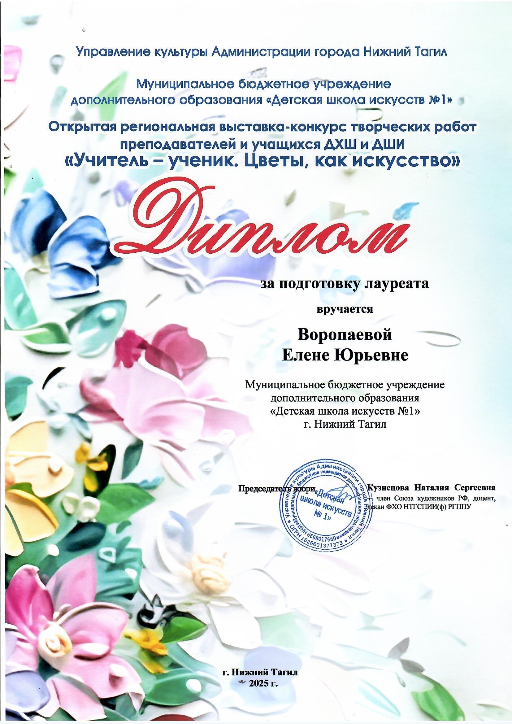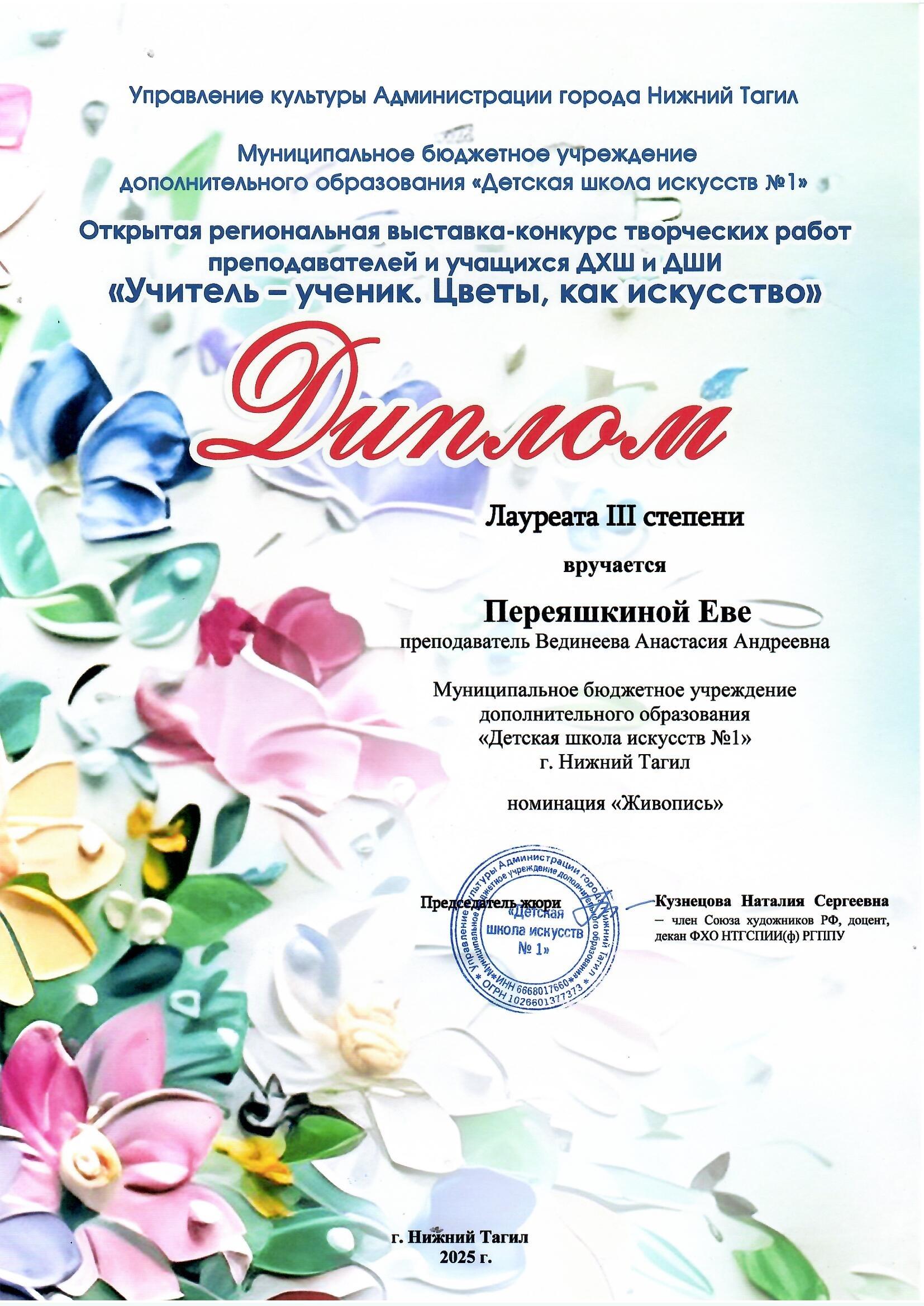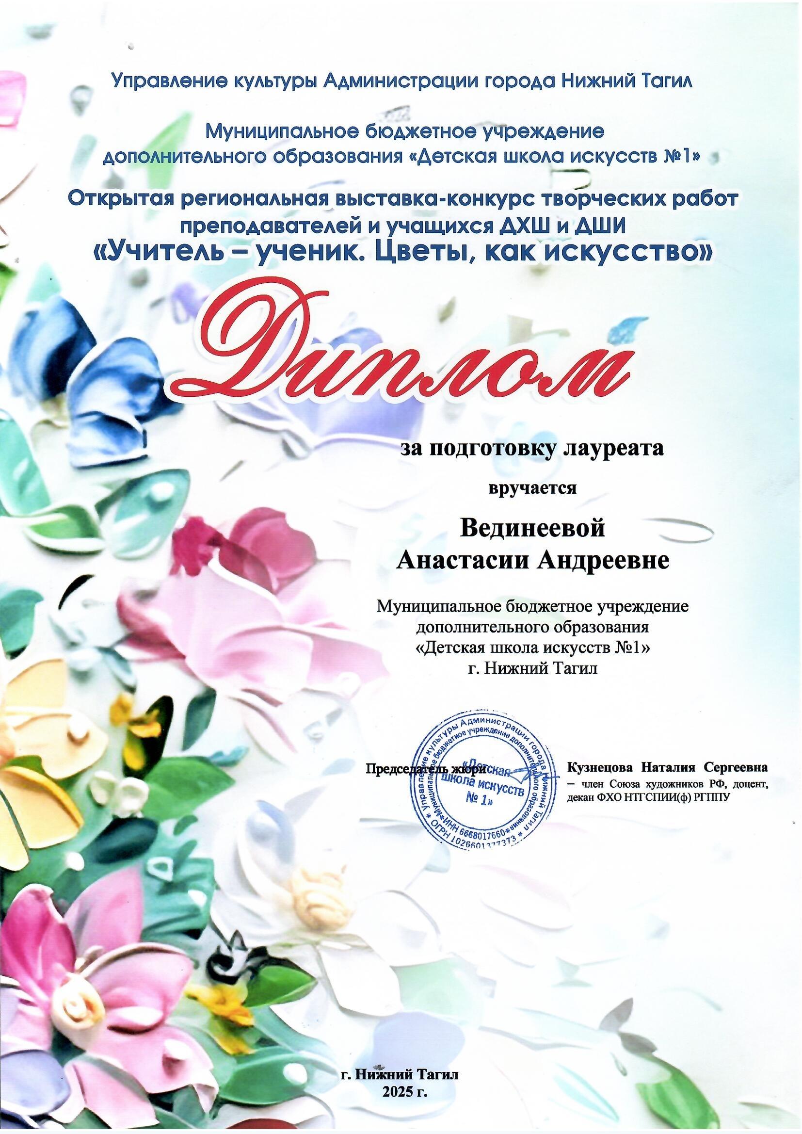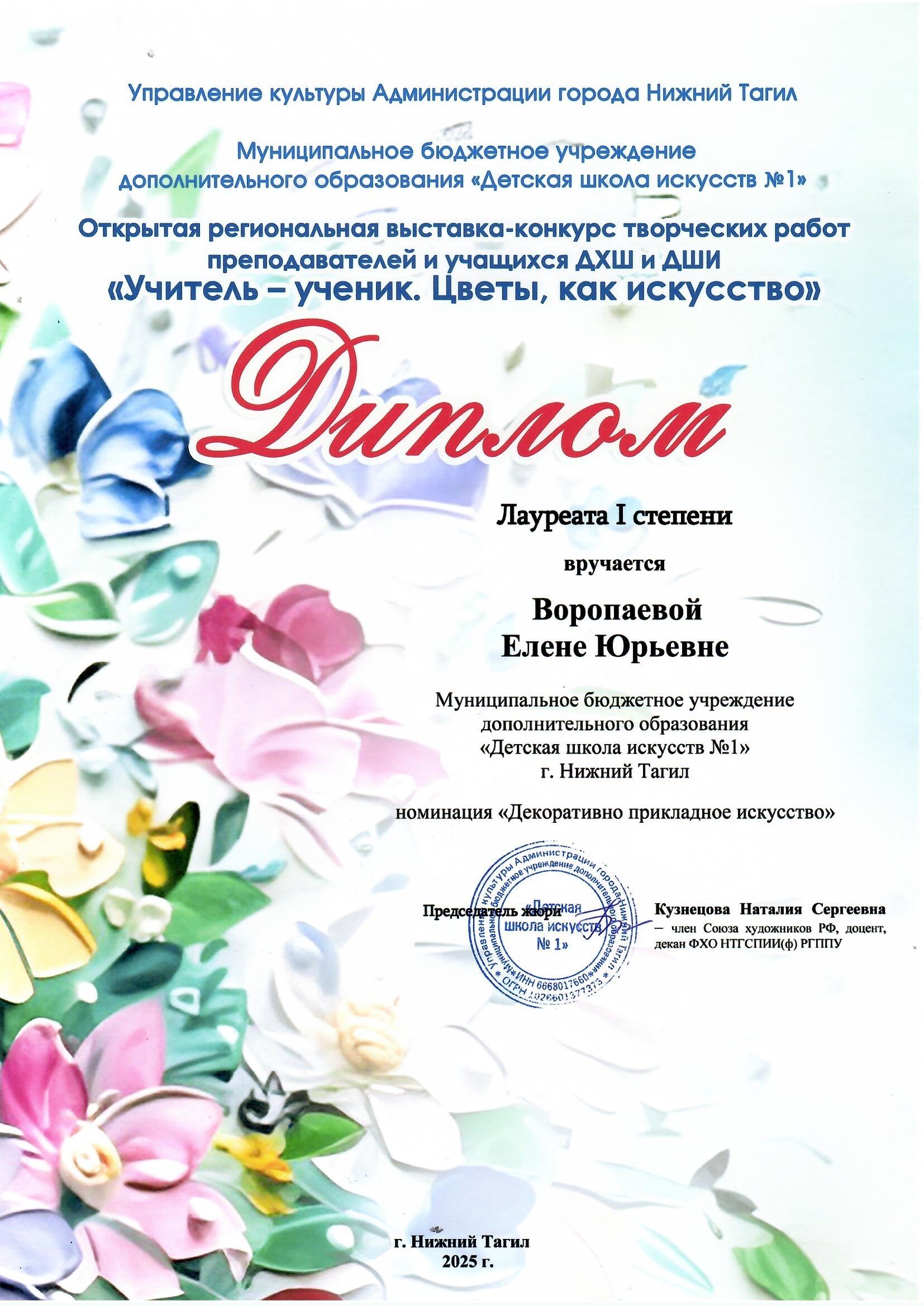 По результатам участия в открытой территориальной выставке-конкурсе для обучающихся по дополнительным общеобразовательным общеразвивающим программам "Волшебный мир творчества" проходившей в период с 29.01.2022 по 26.02.2022 года на базе МБУ ДО "ДХШ№1" г. Нижний Тагил были достигнуты следующие результаты