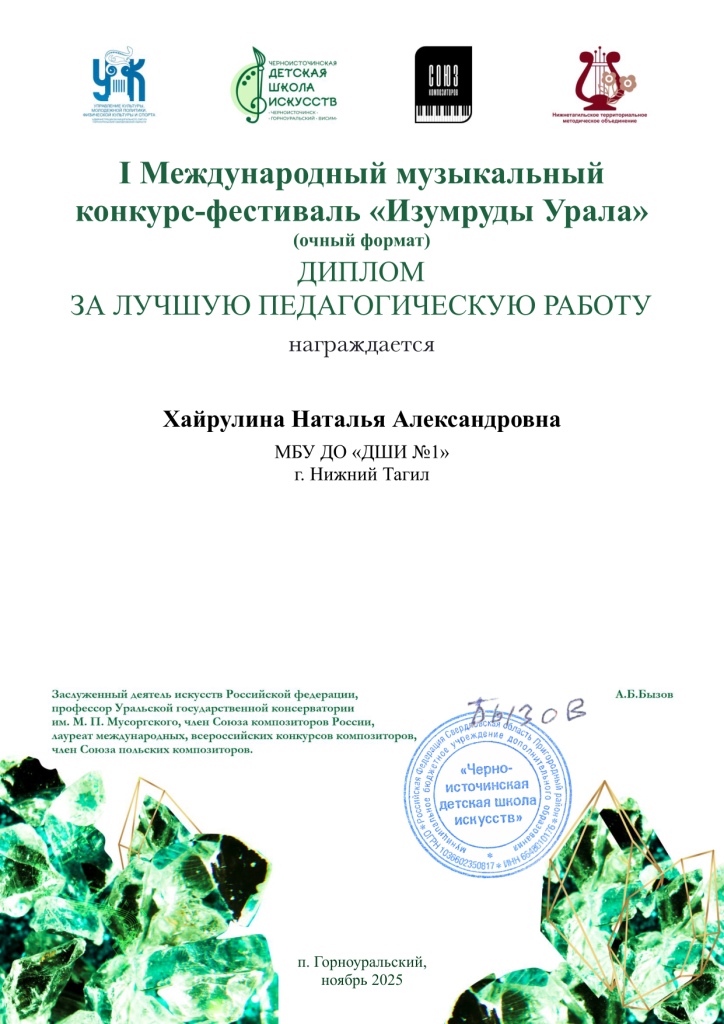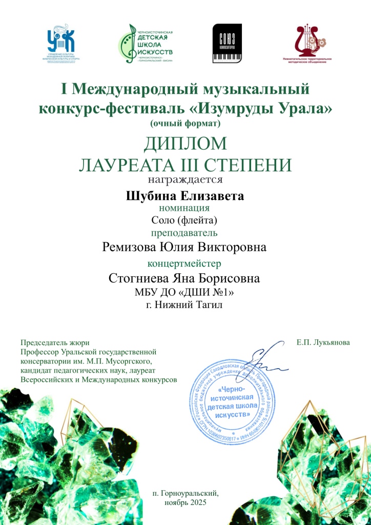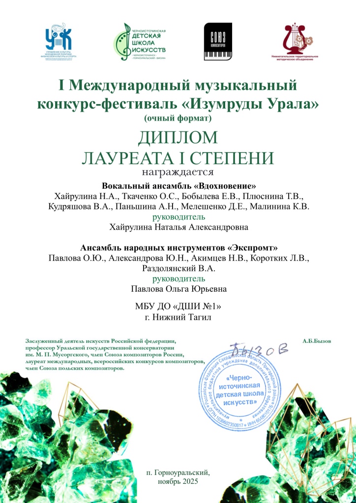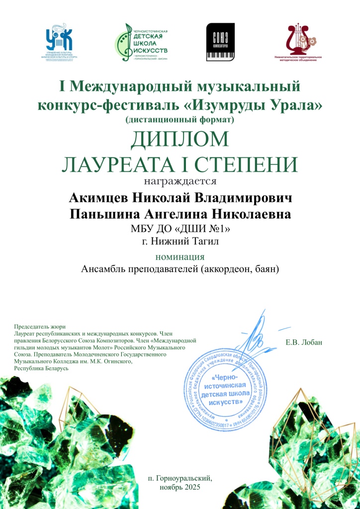 По результатам участия в I Международном музыкальном конкурсе-фестивале «Изумруды Урала», проходившего 20-21 ноября2025г. в Муниципальное бюджетное учреждение дополнительного образования «Черноисточинская детская школа искусств», были достигнуты следующие результаты:
